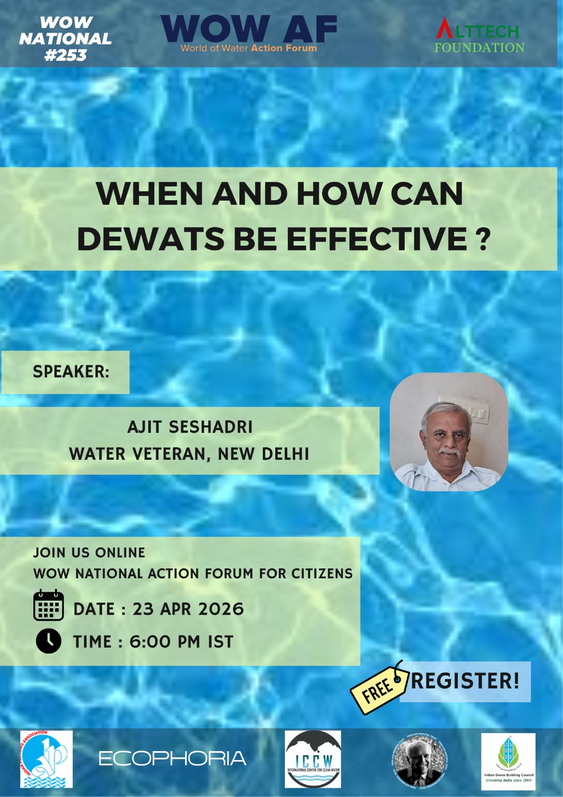 At the turn of 2026, WOW Action Forum is 250 weeks old. It has brought over 300 water leaders from across continents to offer their expertise, their thoughts on how YOU can create water abundance without having to rely on supply from borewells or from municipal water. Why borewells are a serious threat. How borewells can be deposited with water at the least cost. How you can harvest water that you can drink with little treatment. How many thousands have inspired change without looking for reward or recognition.